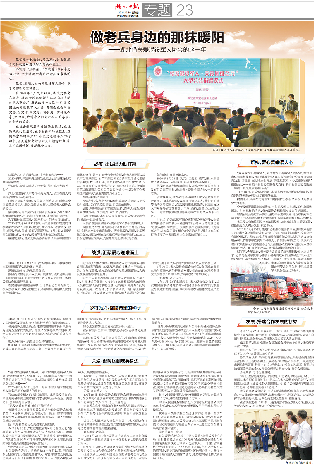 12月30日,湖北日?qǐng)?bào)專題報(bào)道了《做老兵身邊的那抹暖陽(yáng)——湖北省關(guān)愛(ài)退役軍人協(xié)會(huì)的這一年》。自2020 年5 月,湖北省關(guān)愛(ài)退役軍人協(xié)會(huì)成立后,景網(wǎng)公司作為理事會(huì)成員加入省關(guān)愛(ài)協(xié)會(huì)。2021年9月,景網(wǎng)公司被授予省關(guān)愛(ài)協(xié)會(huì)副會(huì)長(zhǎng)單位。在這一年里,景網(wǎng)公司緊跟省關(guān)愛(ài)協(xié)會(huì)步伐,在省委、省政府的正確領(lǐng)導(dǎo)以及湖北省退役軍人事務(wù)廳、省民政廳關(guān)心指導(dǎo)下,緊緊圍繞關(guān)愛(ài)退役軍人工作,引領(lǐng)企業(yè)會(huì)員感黨恩、聽(tīng)黨話、跟黨走。景網(wǎng)與協(xié)會(huì)成員共同用一件件暖心事、貼心事,傳遞著全社會(huì)對(duì)軍人的尊崇、對(duì)老兵的關(guān)愛(ài)。