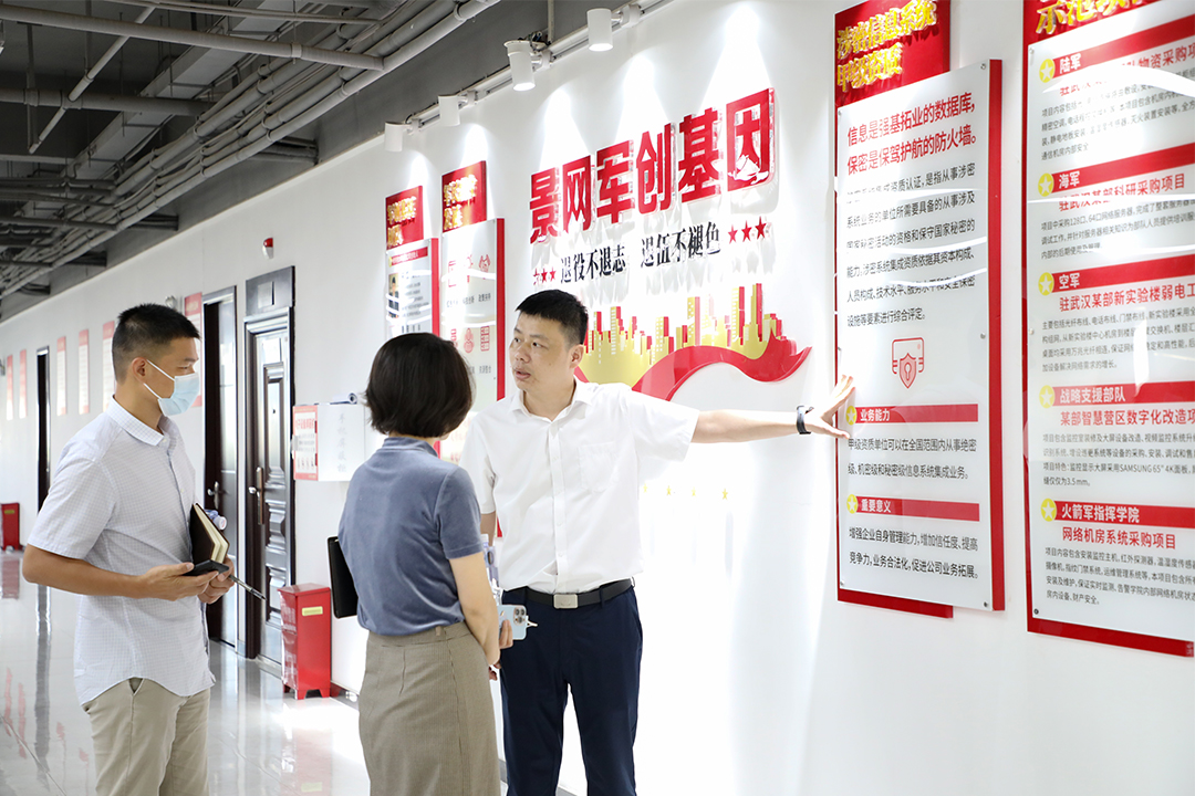 在宋凱的帶領(lǐng)下,呂玉玲一行參觀了景網(wǎng)辦公大樓,智慧城市信息系統(tǒng)運(yùn)維業(yè)務(wù)展示區(qū),軍創(chuàng)企業(yè)基因展示區(qū)、黨群活動(dòng)中心、職工之家等區(qū)域。參觀走訪中,宋凱展示了景網(wǎng)核心技術(shù)、主要服務(wù)產(chǎn)品、企業(yè)經(jīng)營(yíng)模式以及國(guó)防信息化業(yè)務(wù)發(fā)展情況。座談交流中,詳細(xì)介紹了公司黨建、工建情況。