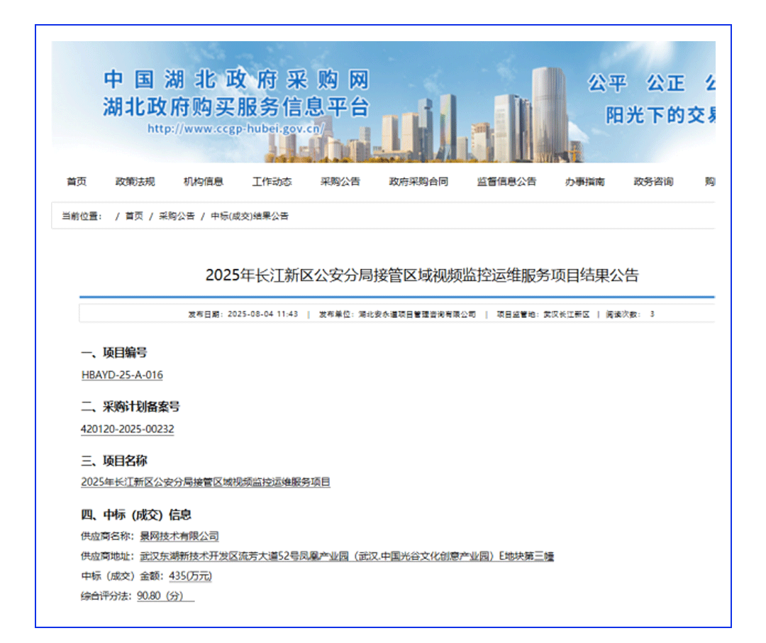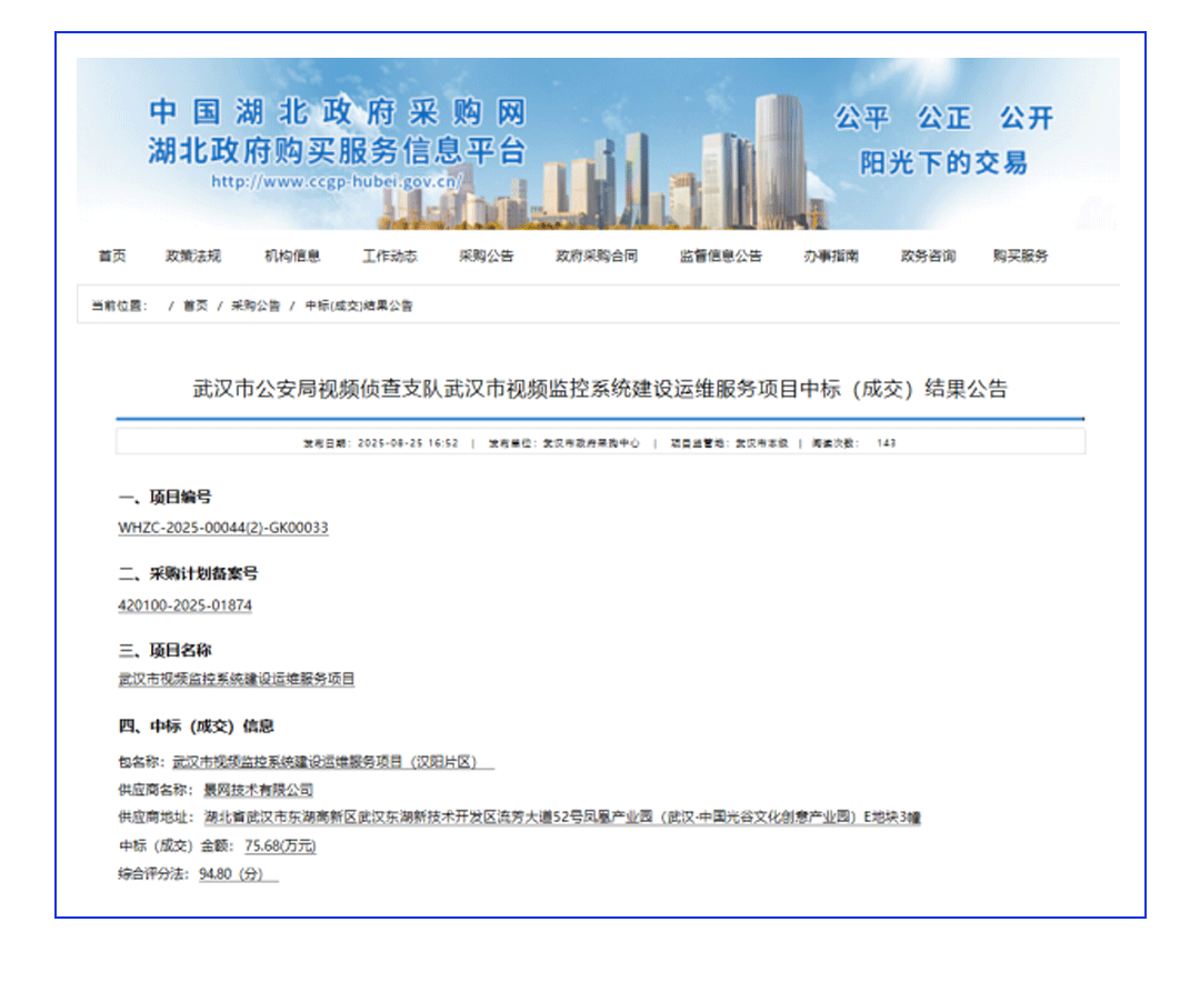 武漢市公安局視頻偵察支隊武漢市視頻監(jiān)控系統(tǒng)建設(shè)運維服務(wù)項目結(jié)果公告