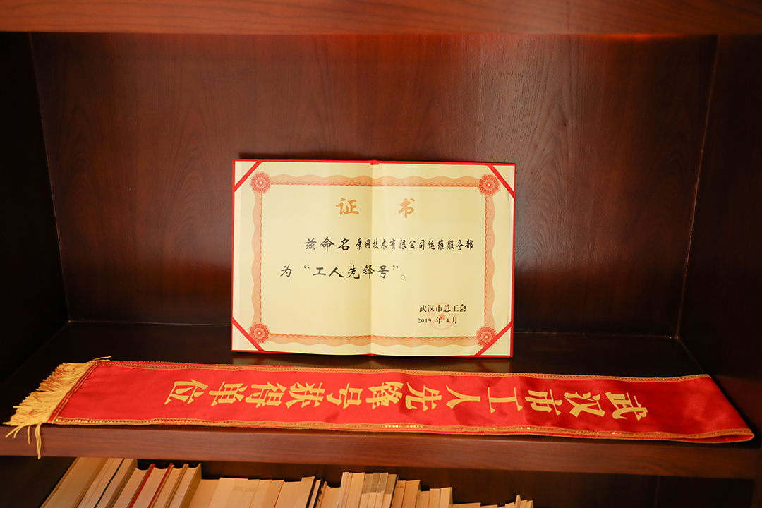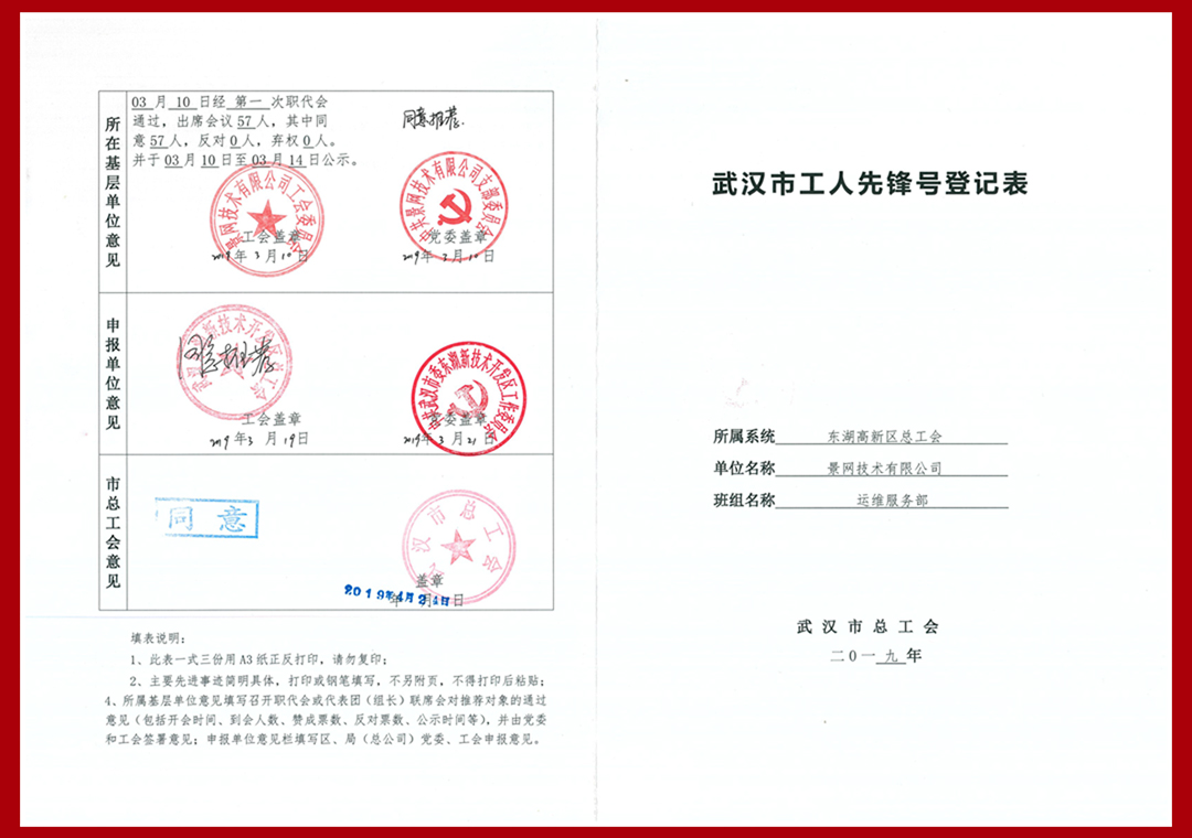 動(dòng)獎(jiǎng)狀、武漢五一勞動(dòng)獎(jiǎng)?wù)乱约拔錆h市工人先鋒號(hào)。景網(wǎng)公司運(yùn)維服務(wù)部被授予武漢市“工人先鋒號(hào)