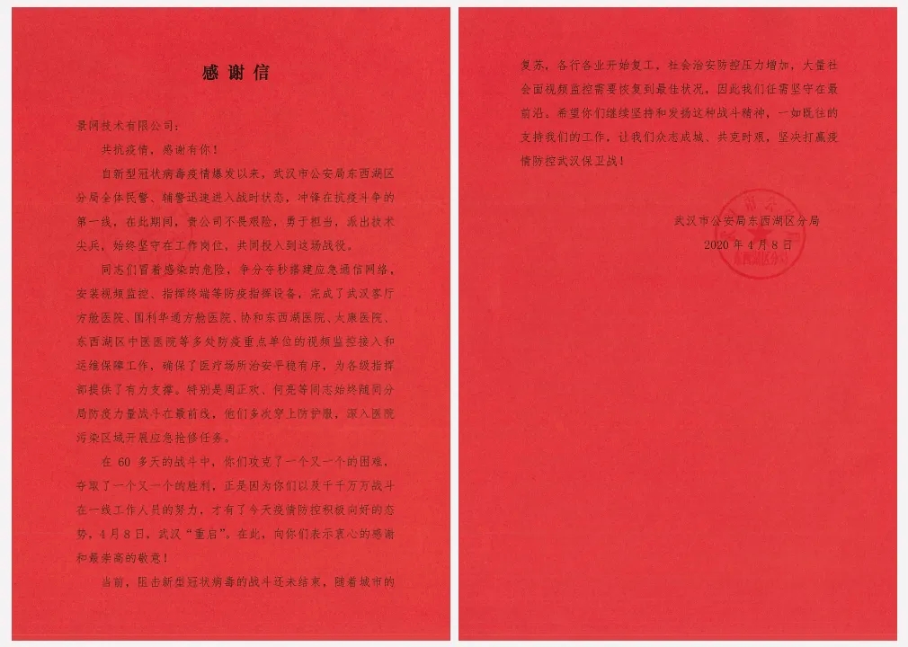 4月10日上午,武漢市公安局東西湖區(qū)分局主要領(lǐng)導(dǎo)委派代表赴景網(wǎng)公司總部,親自送上戰(zhàn)疫感謝信。借此向在防疫一線的運(yùn)維同事,表示衷心的感謝和最崇高的敬意。