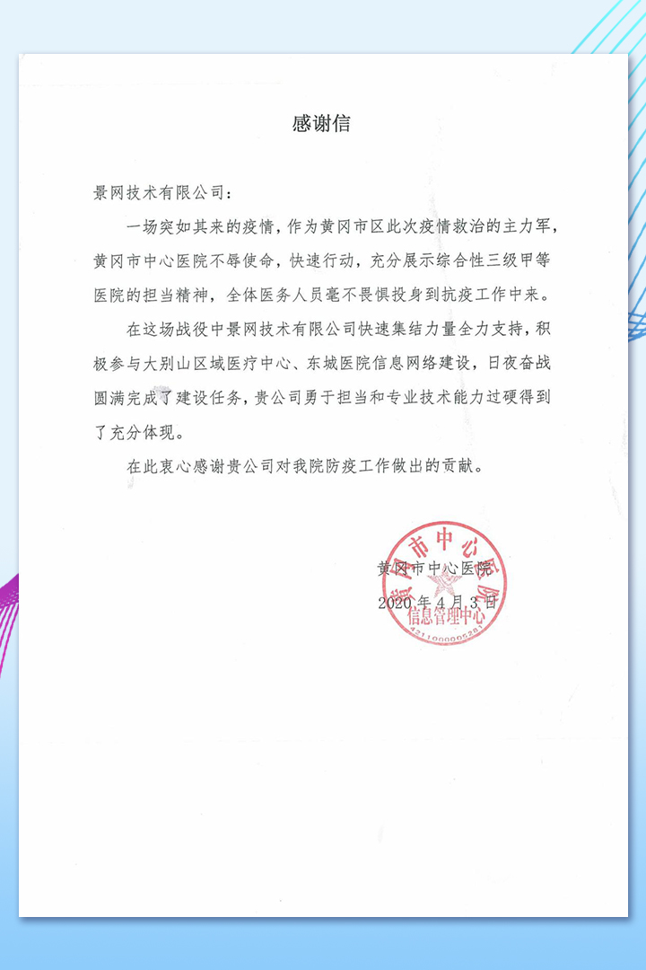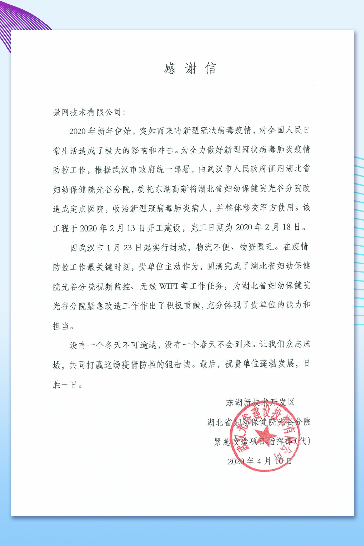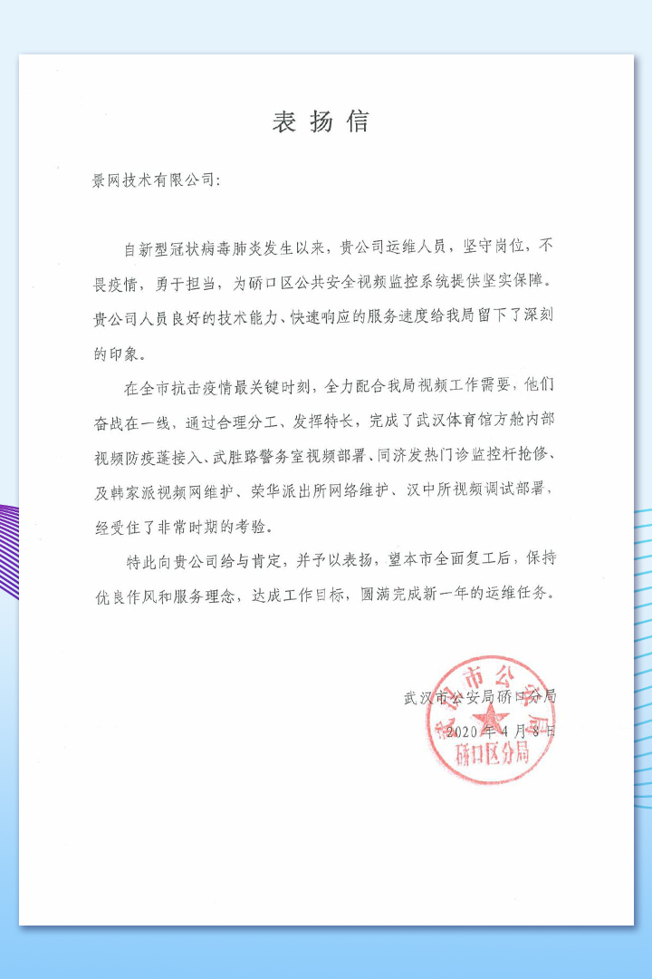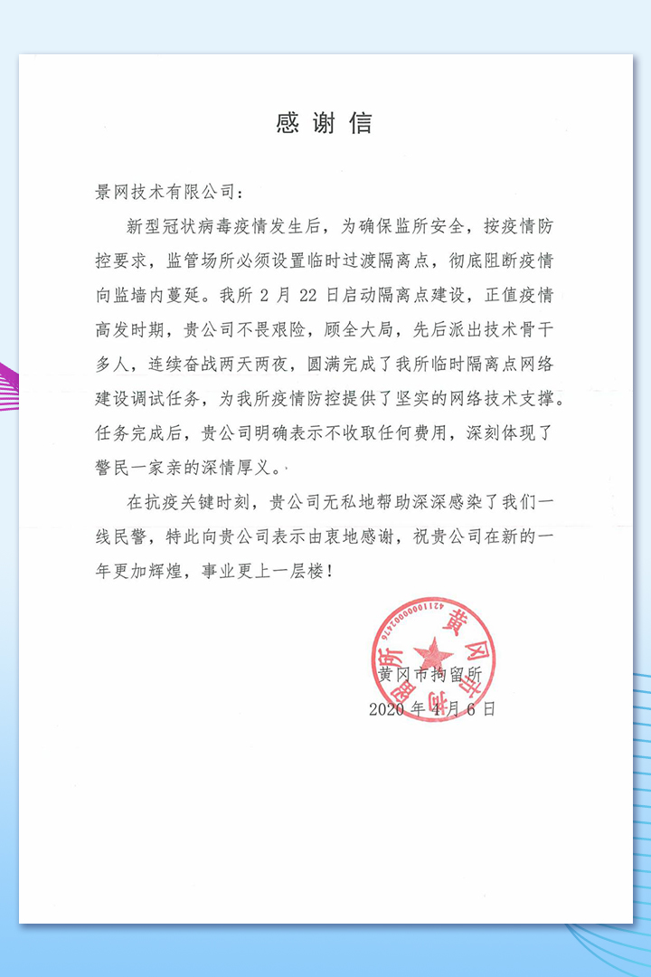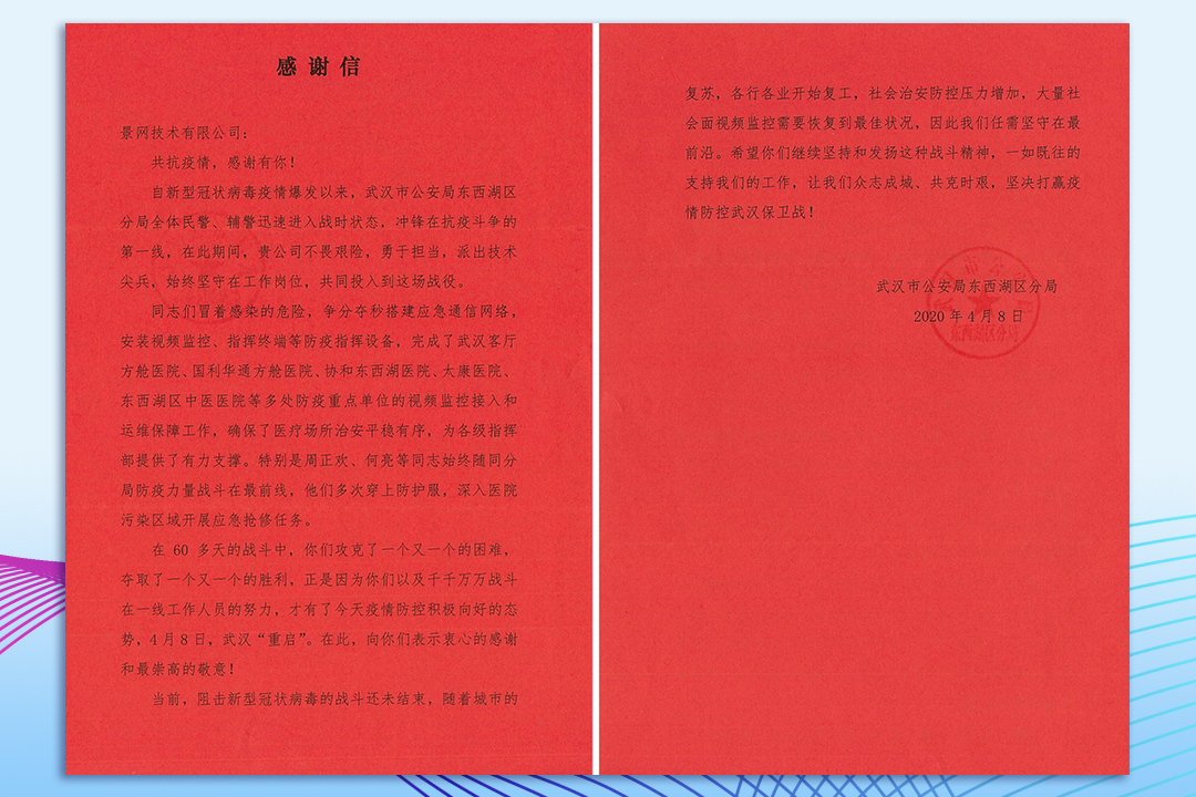 近期,景網(wǎng)公司陸續(xù)收到各地公安機(jī)關(guān)及行業(yè)客戶發(fā)來的戰(zhàn)疫感謝信,特此向景網(wǎng)為防疫保障工作作出了貢獻(xiàn)表示充分肯定及高度贊揚(yáng)。疫情期間,景網(wǎng)運(yùn)維人員不僅堅(jiān)守崗位,為各區(qū)視頻監(jiān)控系統(tǒng)提供堅(jiān)實(shí)保障,同時,還迅速集結(jié)力量,勇于擔(dān)當(dāng),投入到8家方艙醫(yī)院及多家隔離點(diǎn)建設(shè)中。