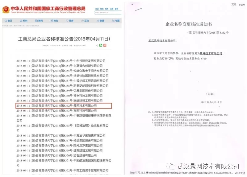 武漢景網(wǎng)通過國家工商總局審核將正式升級更名為“景網(wǎng)技術有限公司”